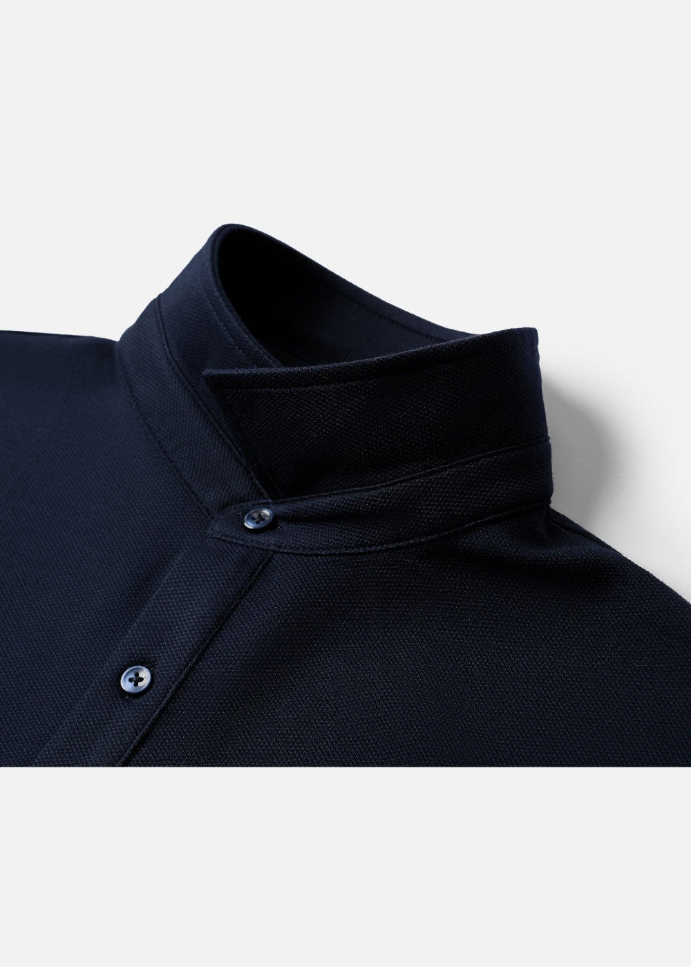 - Chi tiết: Cổ áo có chân (Stand Collar) được ép keo lụa gia cố bên trong. Giúp lá cổ luôn đứng và phẳng như một chiếc sơ mi công sở, không bị rũ hay quăn mép sau thời gian dài sử dụng.