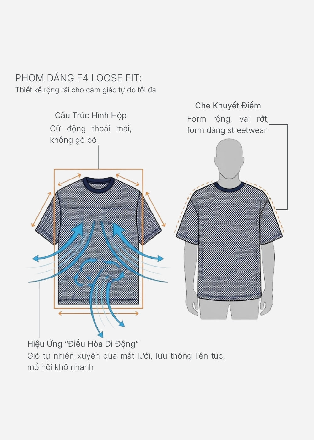 Phom Loose/Boxy trẻ trung thời thượng kết hợp vai rớt tạo cảm giác vai rộng hơn, Vải lưới thoáng mát nhưng vẫn dày dặn giữ phom áo tốt sau nhiều lần giặt.