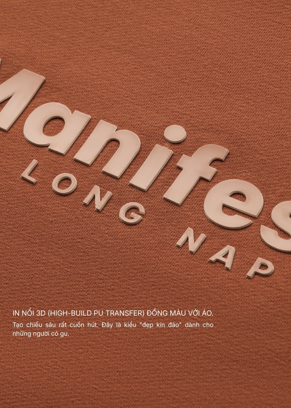 - Họa tiết Low-key: Chữ in nổi 3D đồng màu (Tone-on-tone) tạo điểm nhấn sang trọng, kín đáo và có chiều sâu.